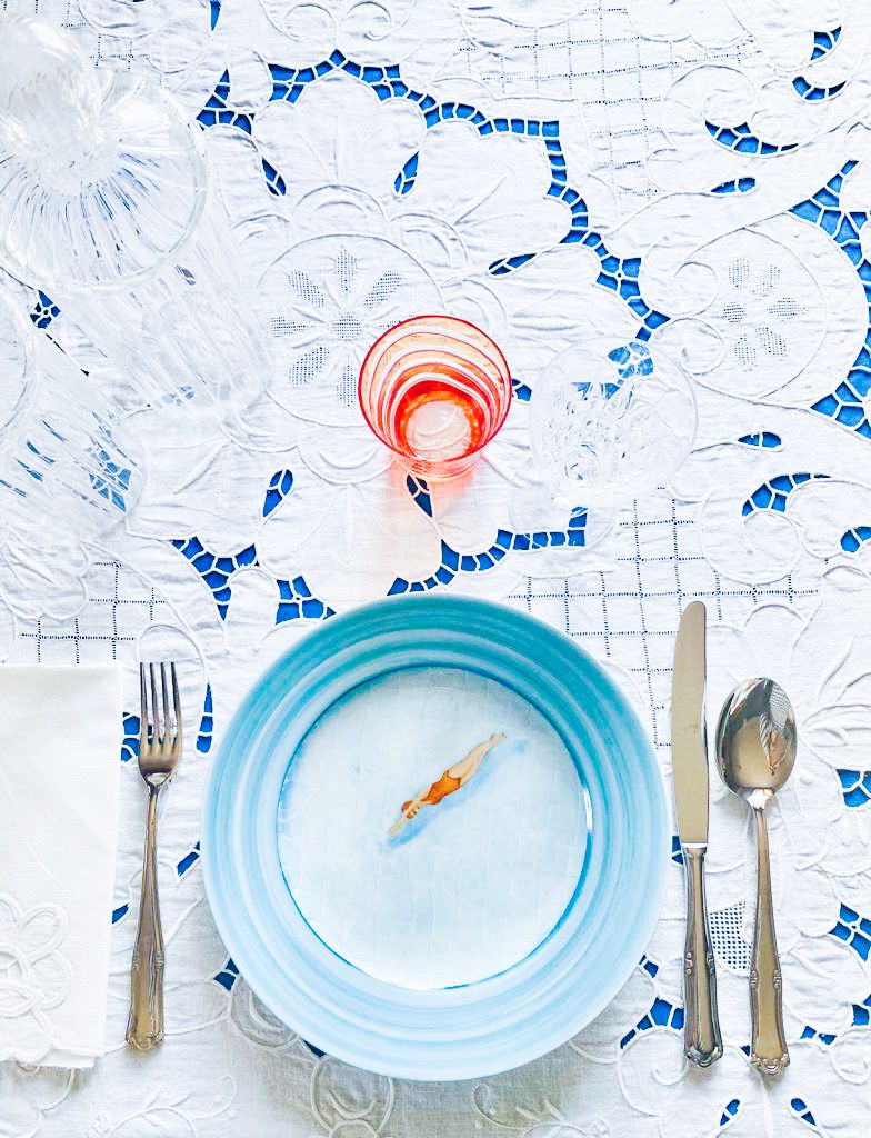 Ispirato all'atmosfera rilassata della Capri degli anni '50 e '60, questo prezioso piatto in porcellana bianca raffigura una donna che indossa un elegante cappello ed esce da una piscina. L'abile processo di decorazione manuale prevede anche l'applicazione di smalti madreperlacei e la colorazione turchese della tesa, realizzata al tornio. Resiste alle impostazioni delicate della lavastoviglie, ma si consiglia il lavaggio a mano.